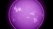 Zum Jahresende zeigen sich mehrere Fleckengebiete auf den Übersichtsaufnahmen im H-Alpha-Licht (656nm),…